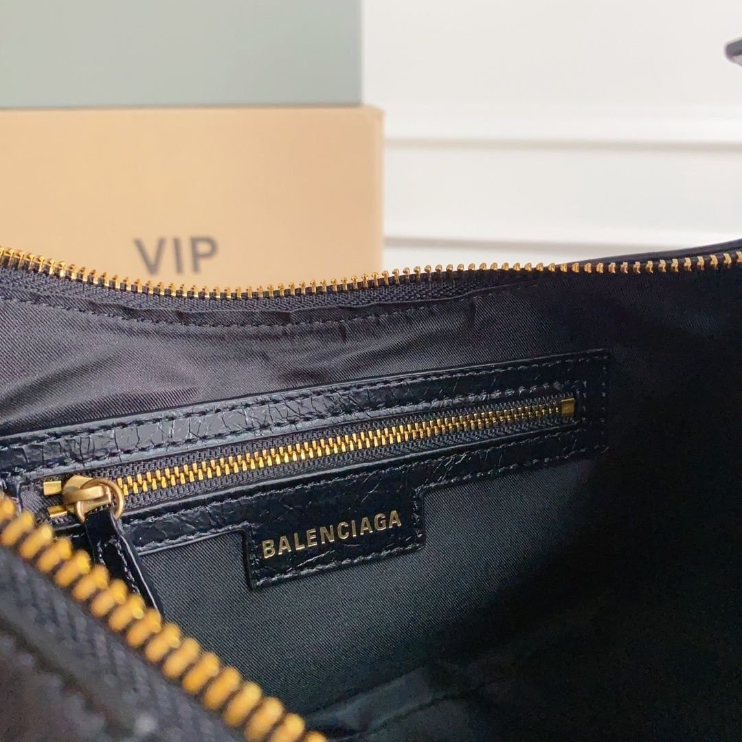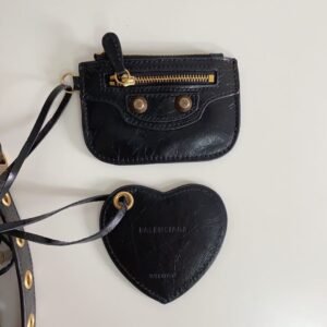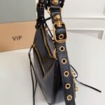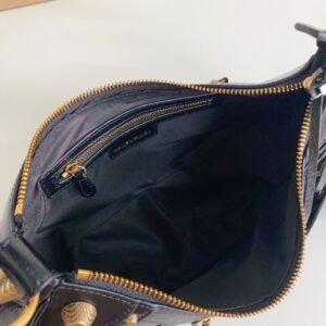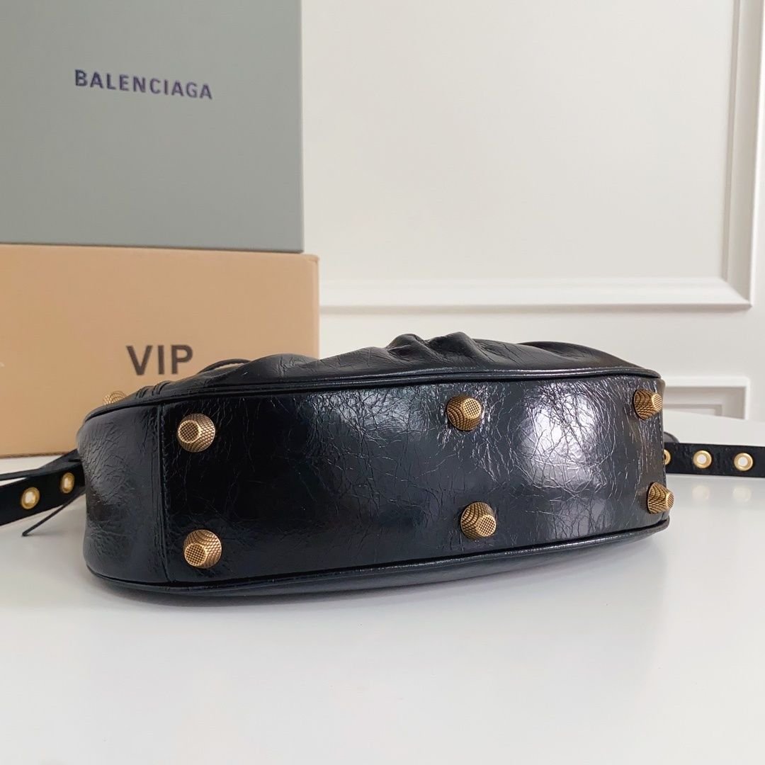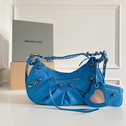Balenciaga Le Cagole Half-Moon Underarm Dumpling Bag, featuring adjustable woven straps with additional eyelets, an external leather card holder, and a heart-shaped mirror charm, continuing the classic biker-inspired elements.