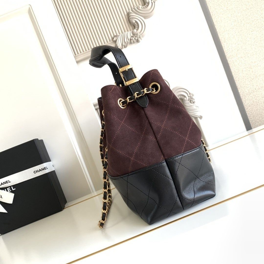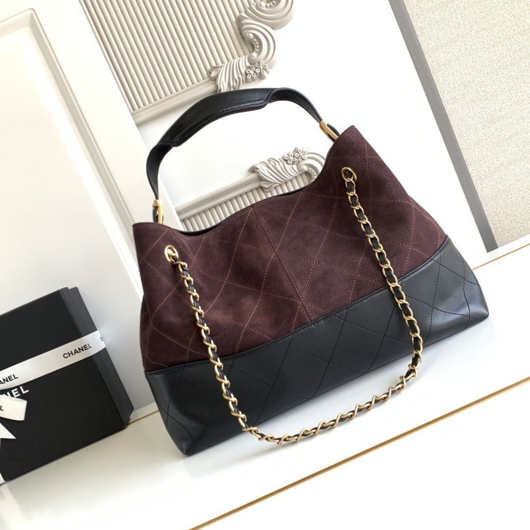 Chanel 25A Hobo Tote, suede and leather in perfect harmony, black and gold chain detailing adds a touch of sophistication.