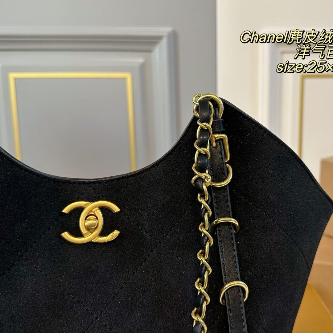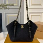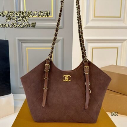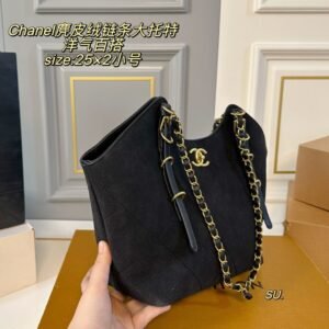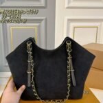 This tote bag reimagines the Marmont collection with a fresh silhouette for the Fall/Winter 2025 season, transforming from a structured tote to a softly contoured bucket bag. Featuring both top handles and a chain shoulder strap, it offers versatile styling options for diverse fashion looks.