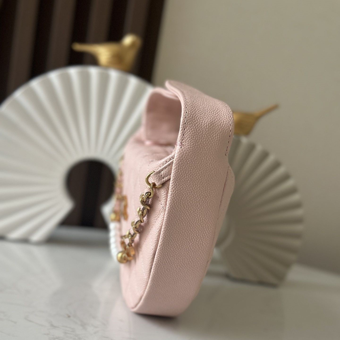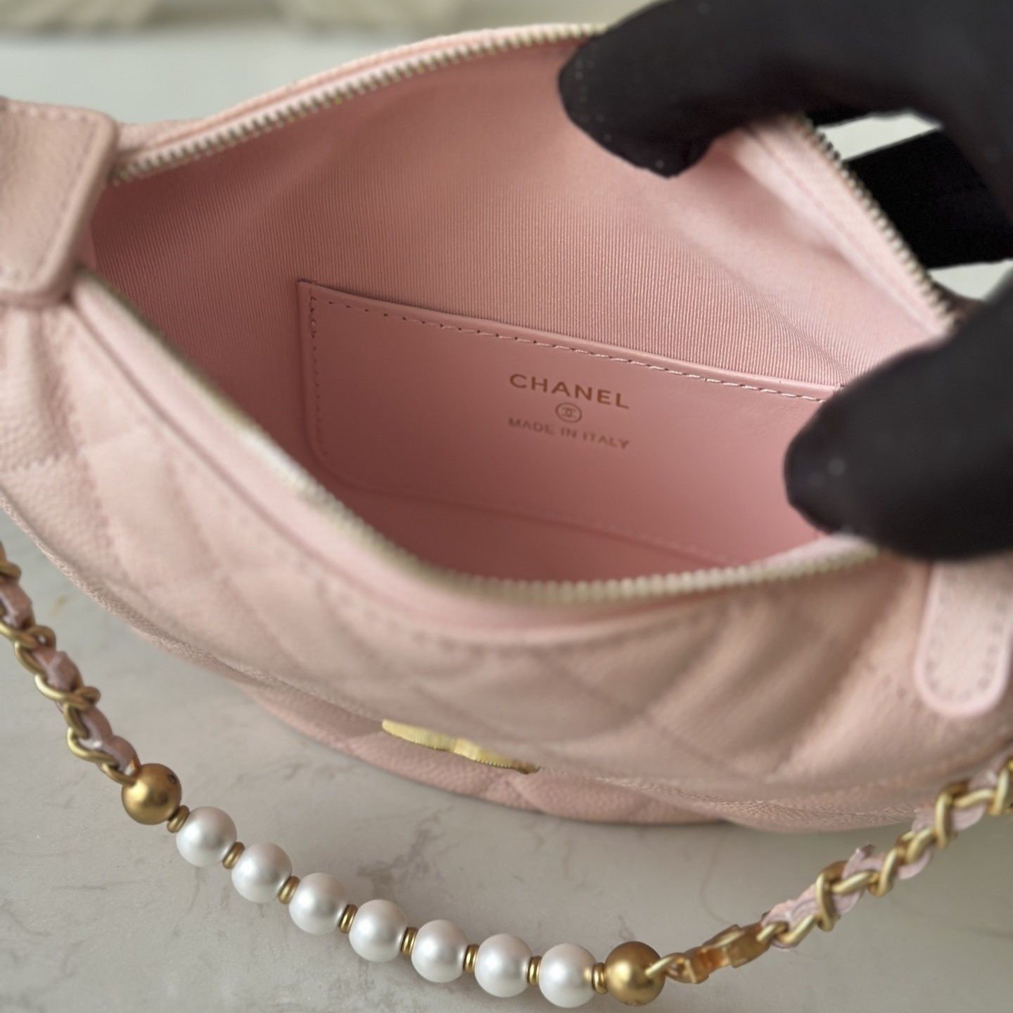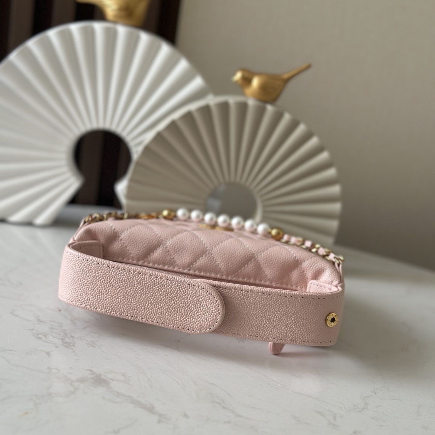 Seven pearls bling-bling along the chain, with diamond-pattern stitching impeccably neat.