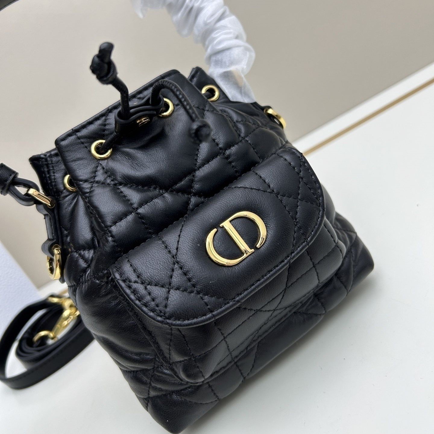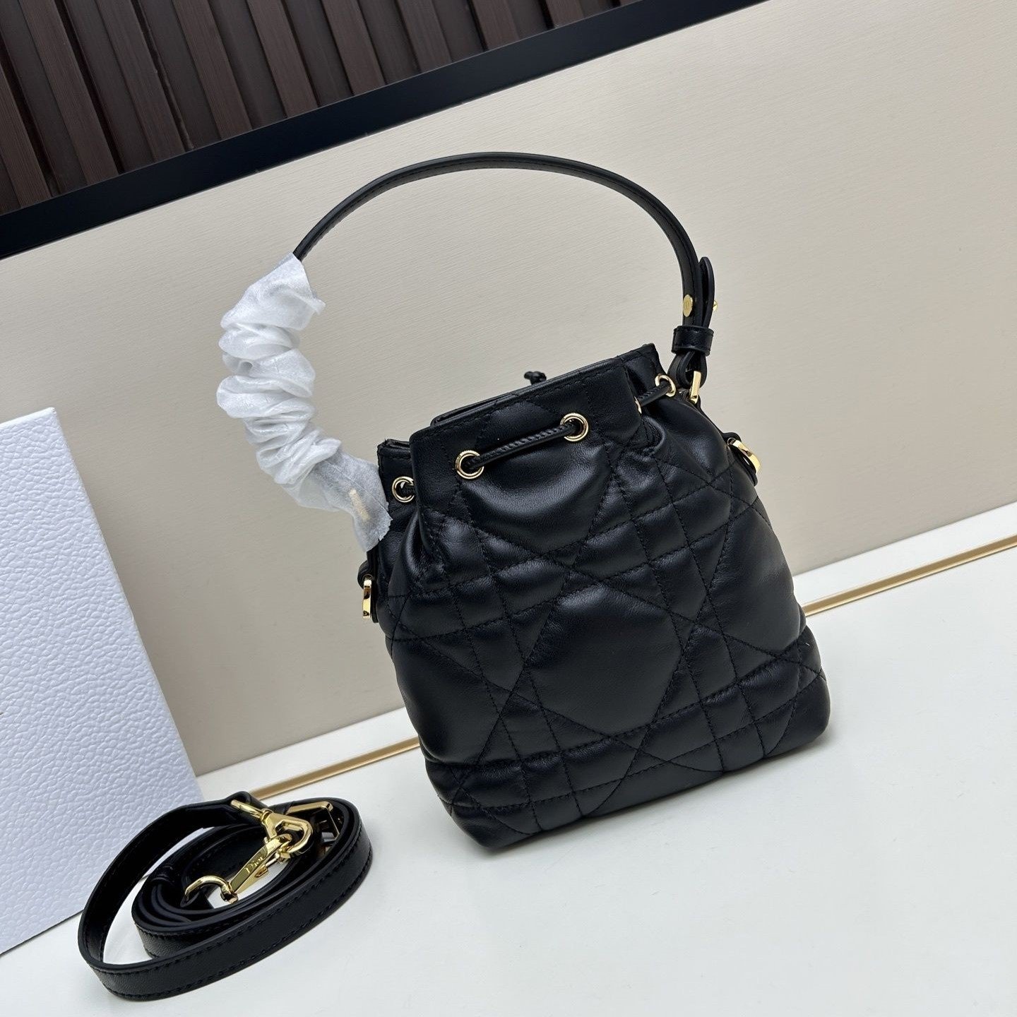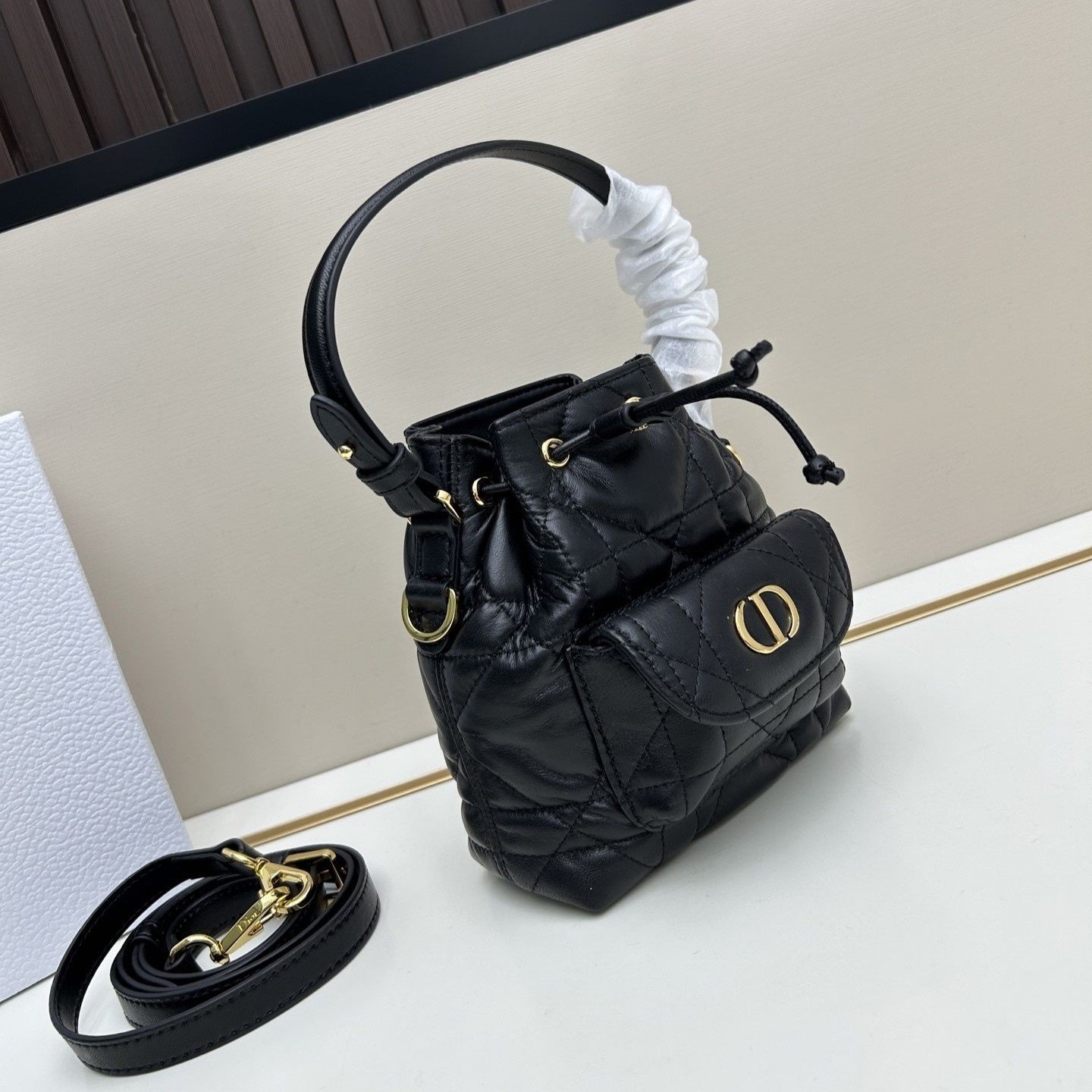 The Dior Caro bucket bag is meticulously crafted from black lambskin leather, adorned with oversized cannage and satin-finished stitching. It features a drawstring compartment.