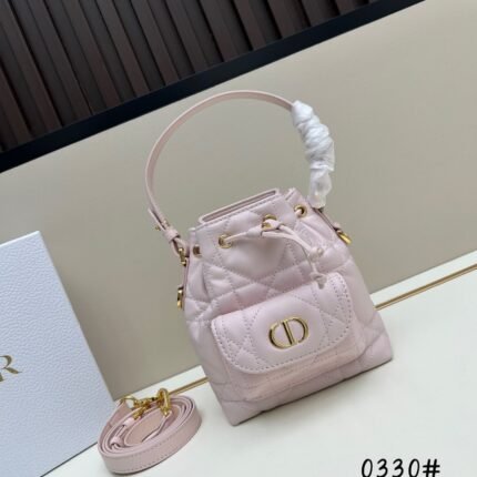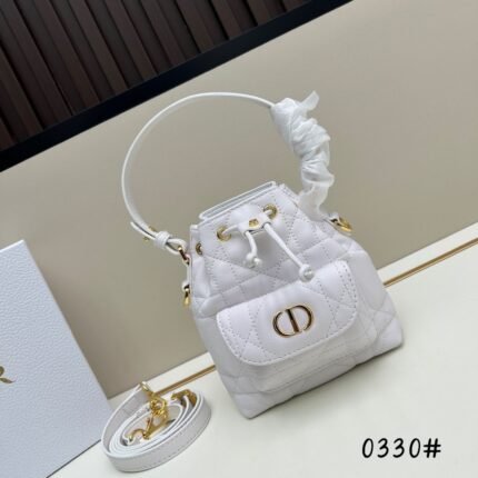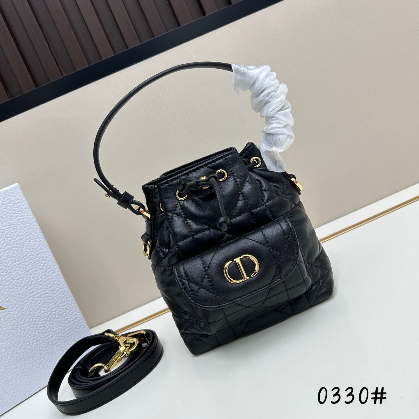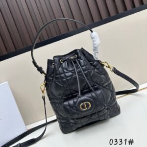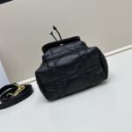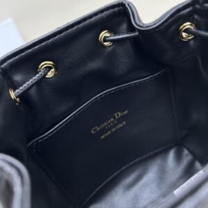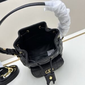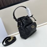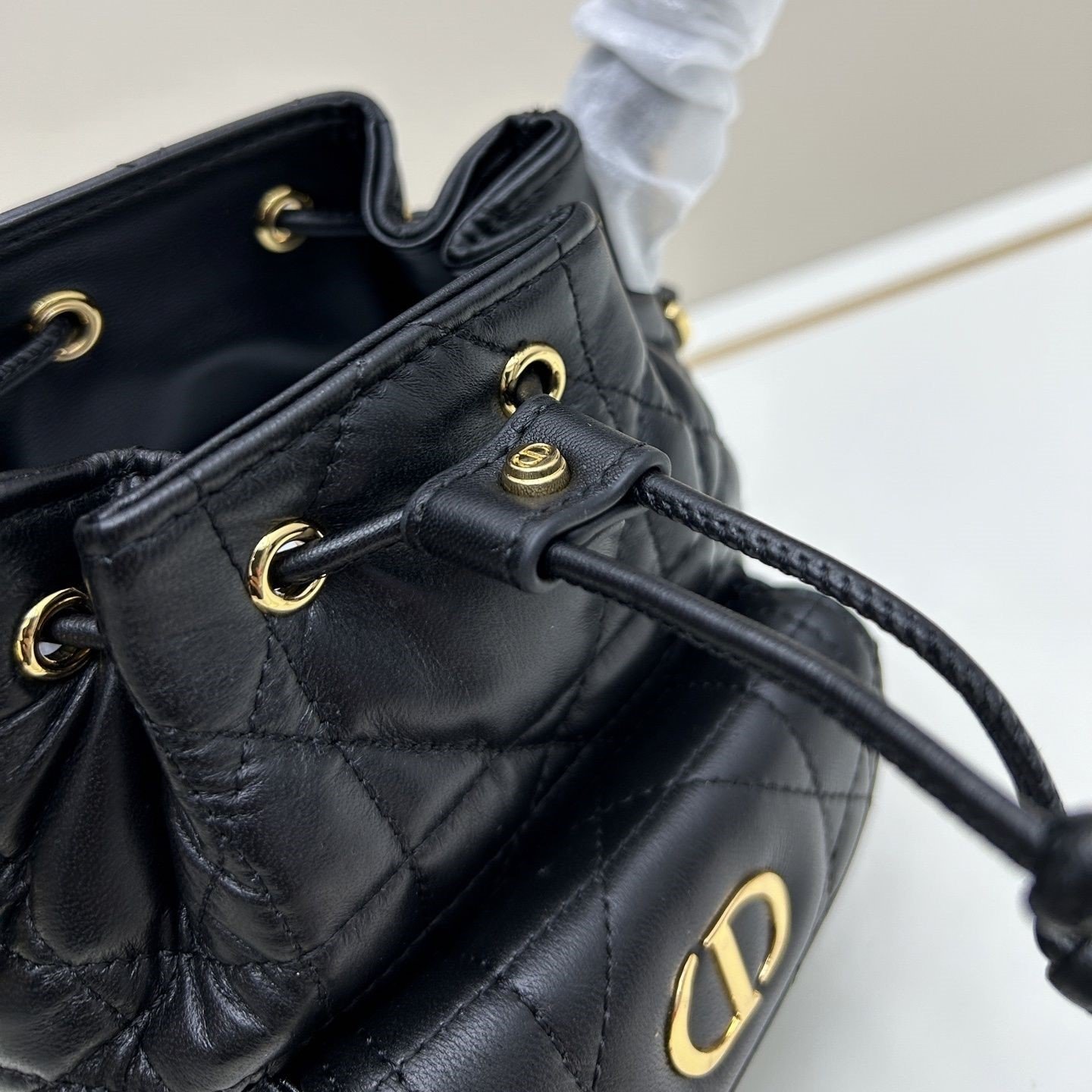 The Dior Caro bucket bag is meticulously crafted from black lambskin leather, adorned with oversized cannage and satin-finished stitching. It features a drawstring compartment.