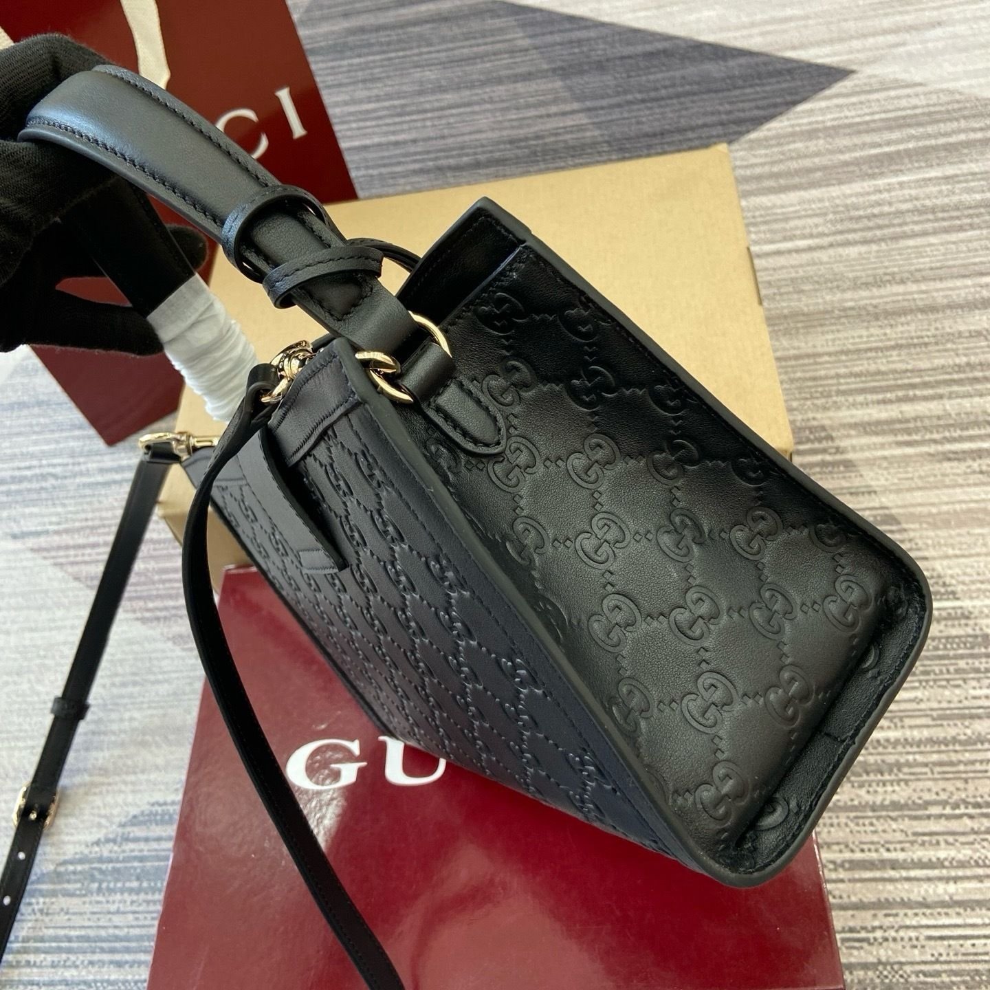 GG embossed calf leather, light gold-tone hardware, black cotton lining