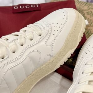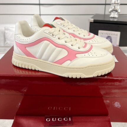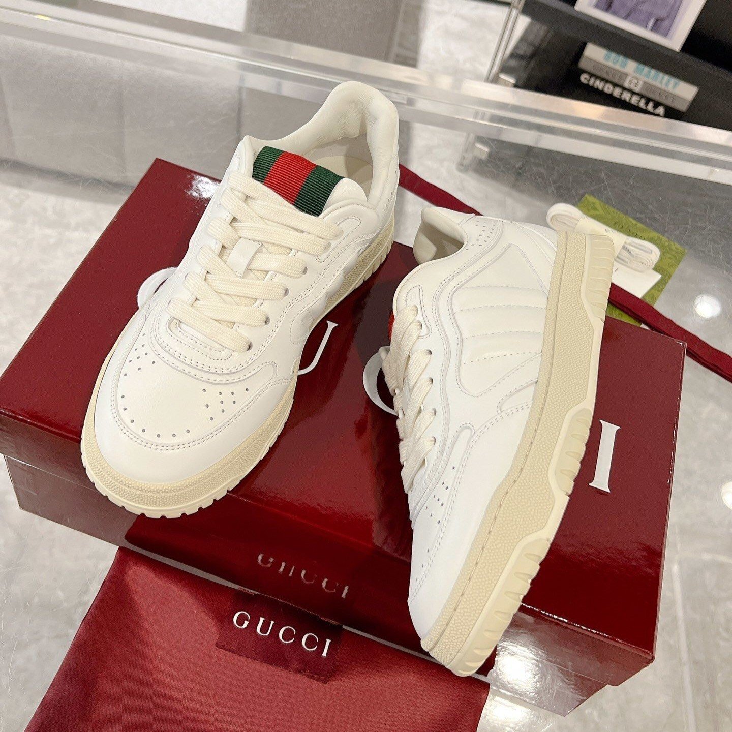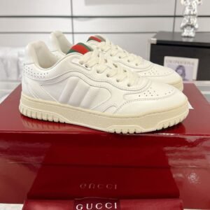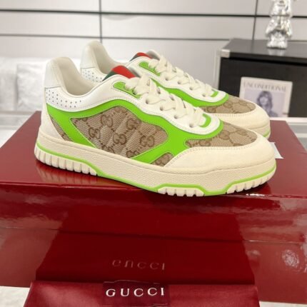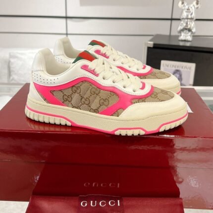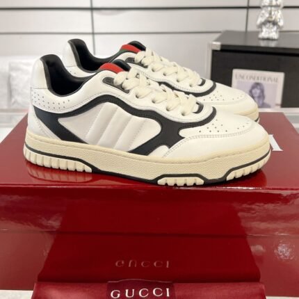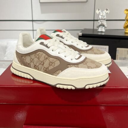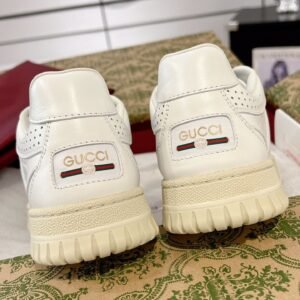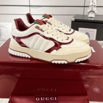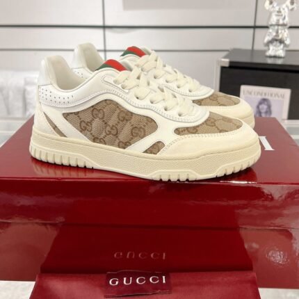 The Gucci Re-Web high-top sneakers feature a basketball-inspired silhouette, cleverly incorporating perforated panels and distressed detailing.