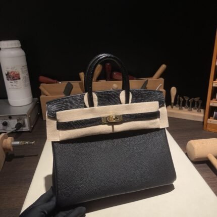 gold-tone and silver-tone hardware, hand-stitched with pure amber thread,