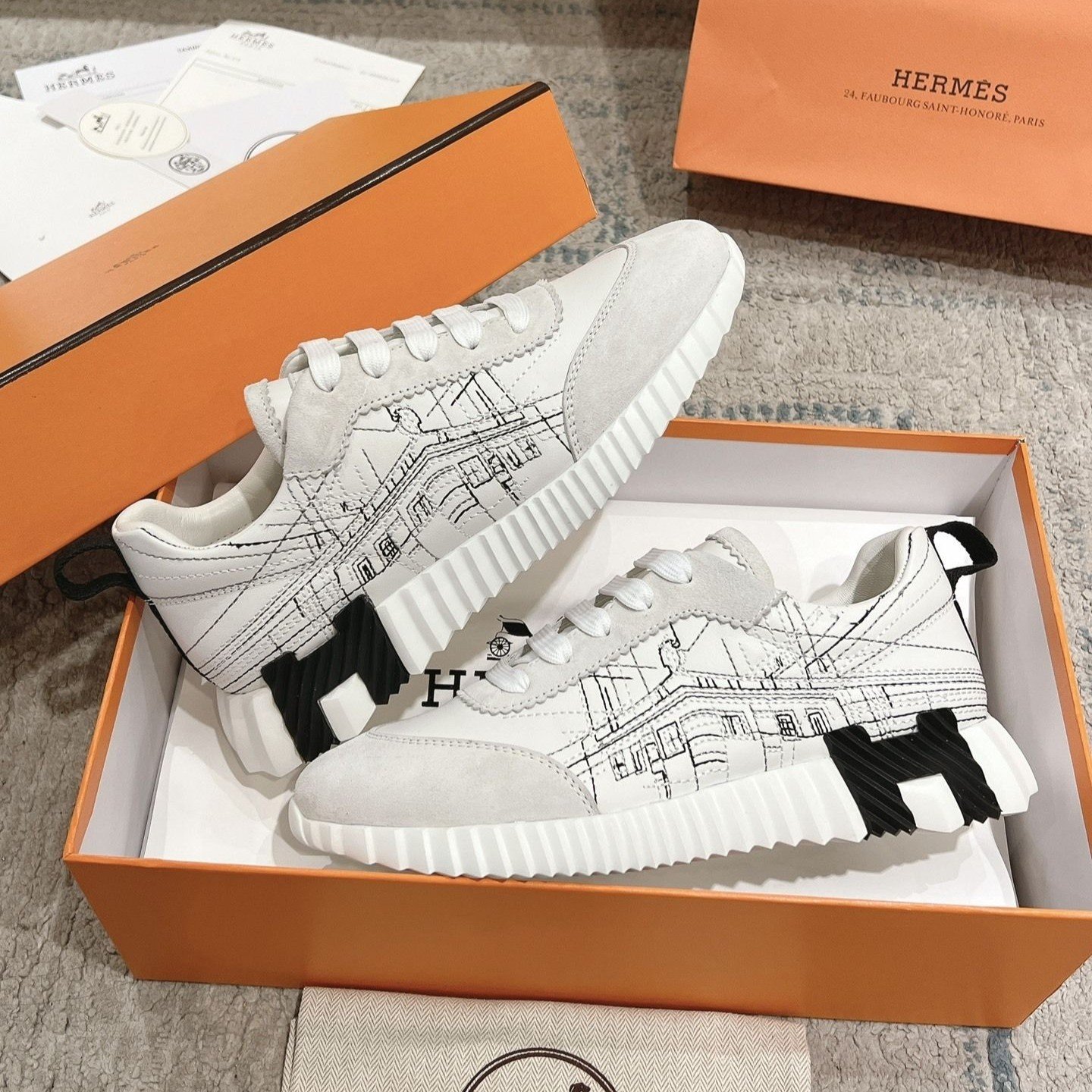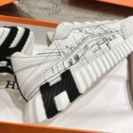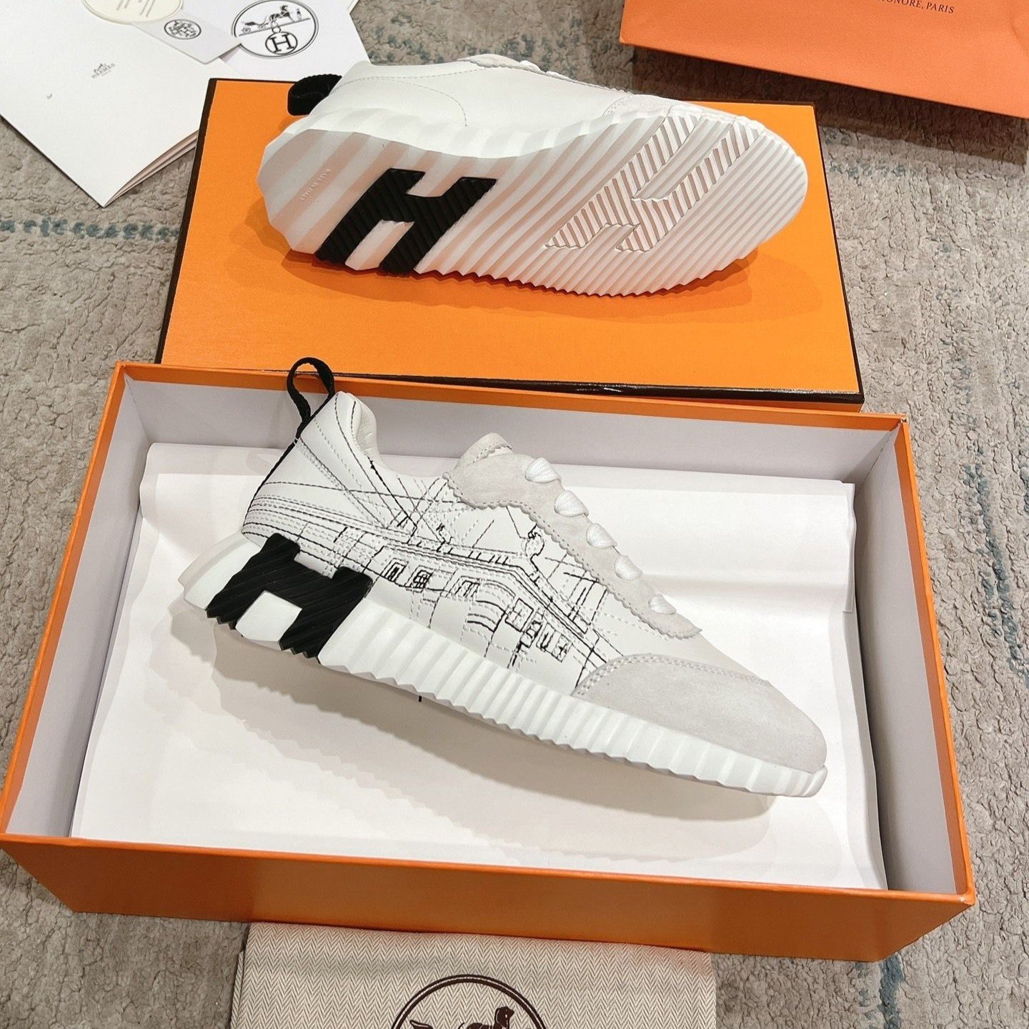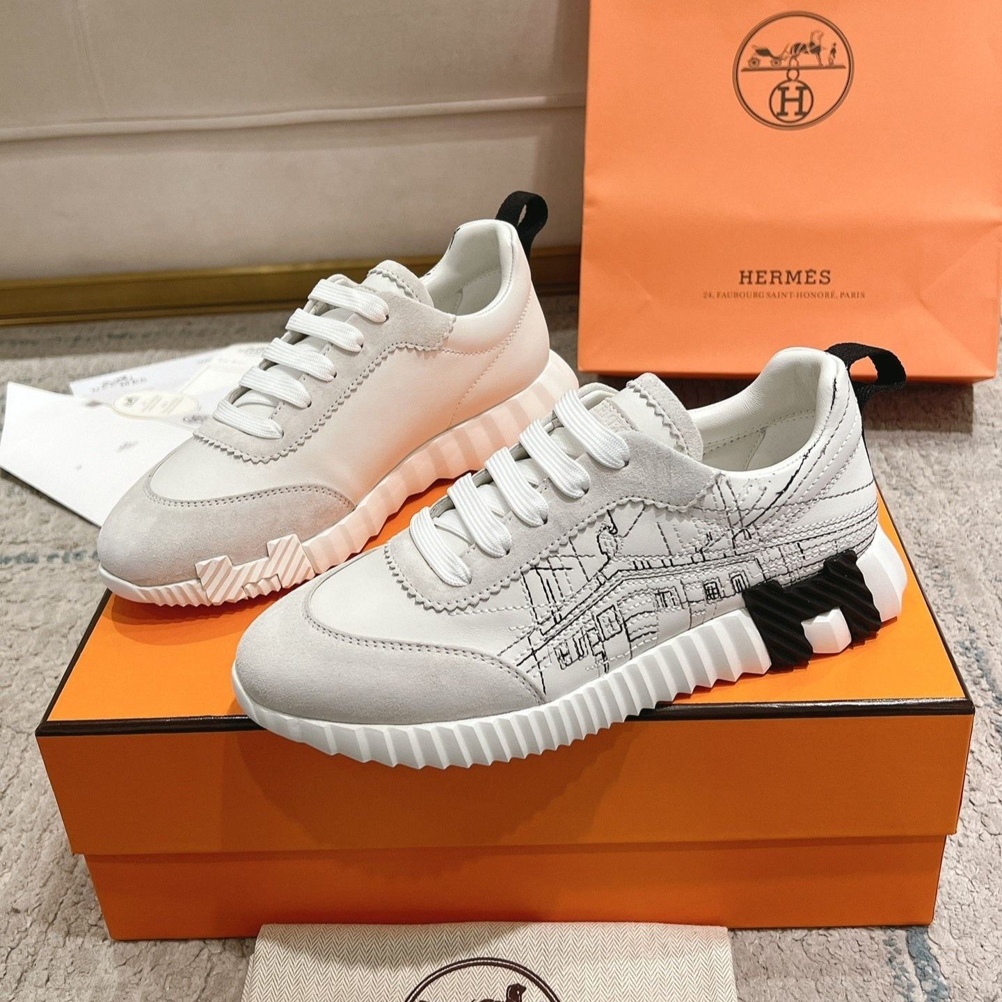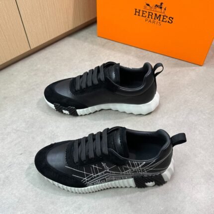 Hermès Bouncing Sneaker combines high-tech canvas with suede goatskin, featuring an exaggerated “H” logo on the rubber sole.