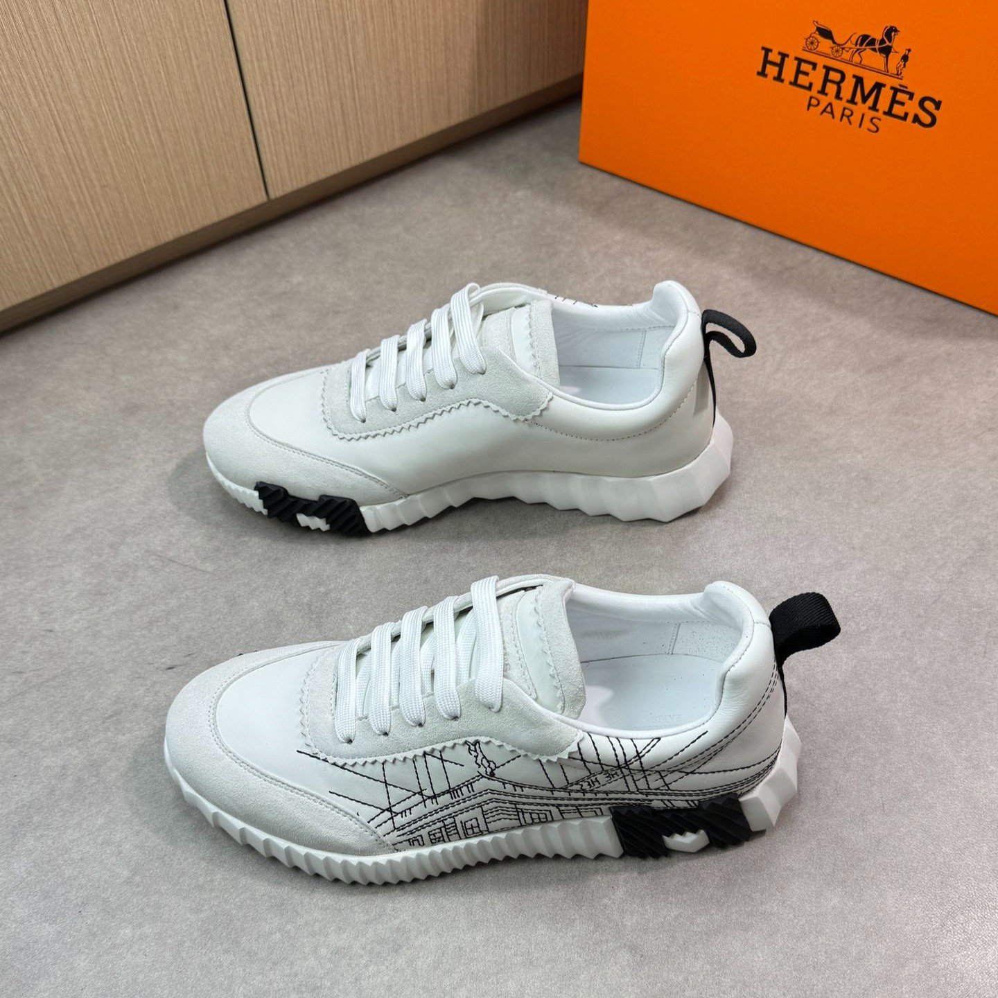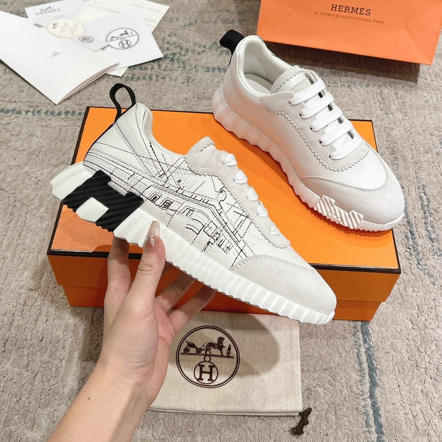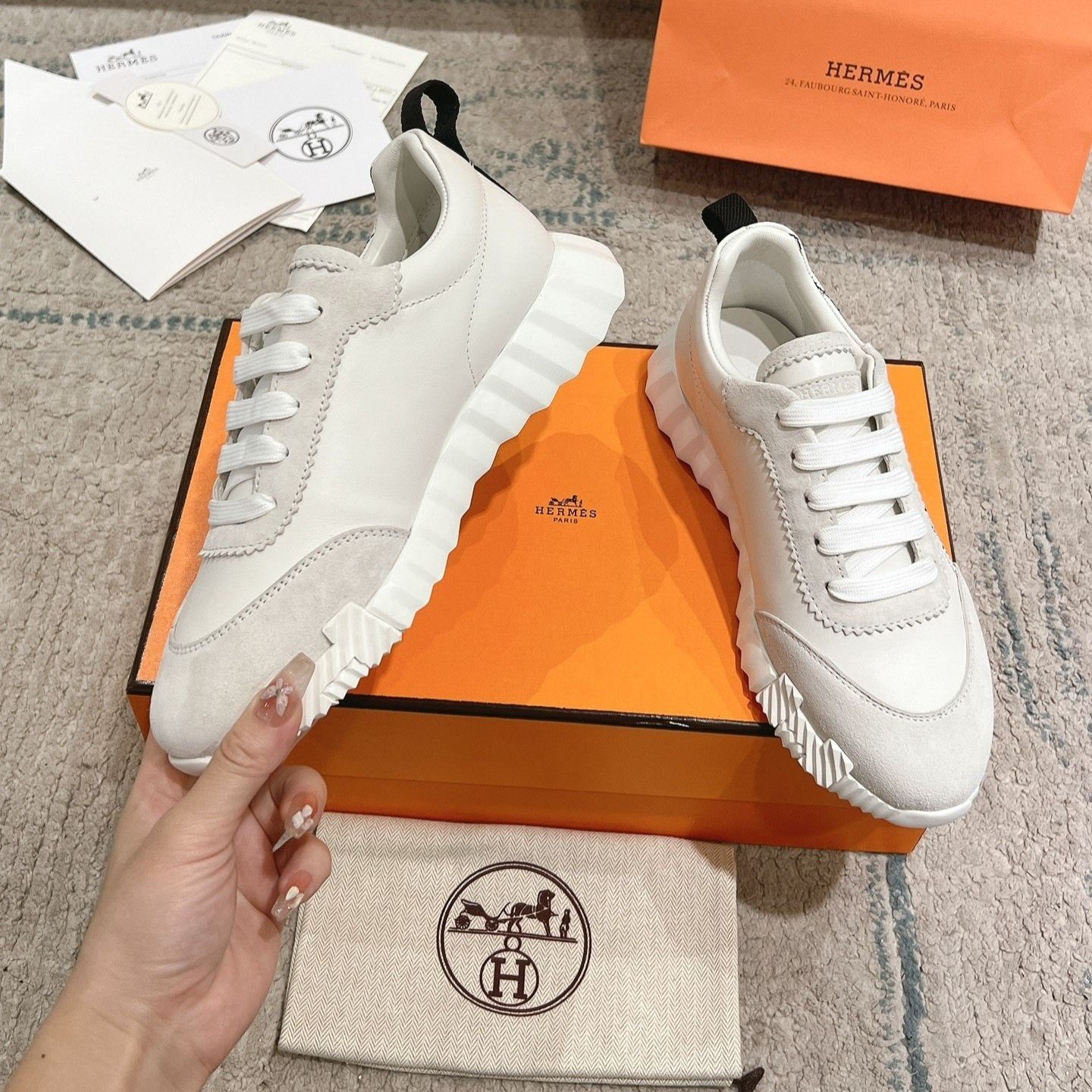 Hermès Bouncing Sneaker combines high-tech canvas with suede goatskin, featuring an exaggerated “H” logo on the rubber sole.