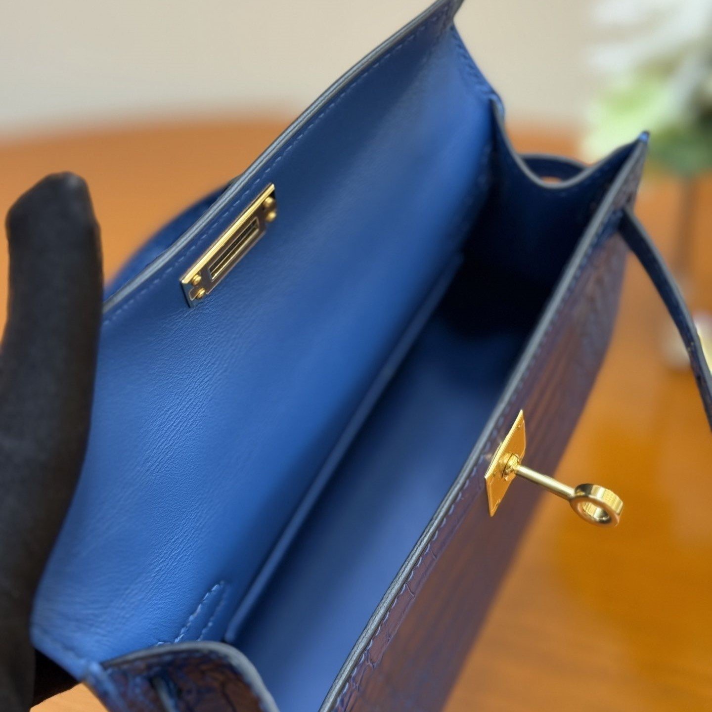 Two internal pockets* with gold suede lining offer great practicality, perfect for everyday use.