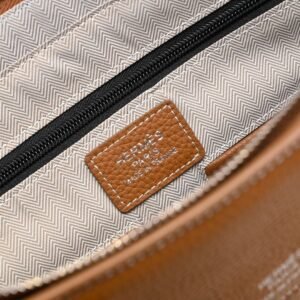 The Hermès Sac à Dépêches is crafted from a fabric made with recycled polyester fiber, top-grain cowhide leather, and cotton yarn,