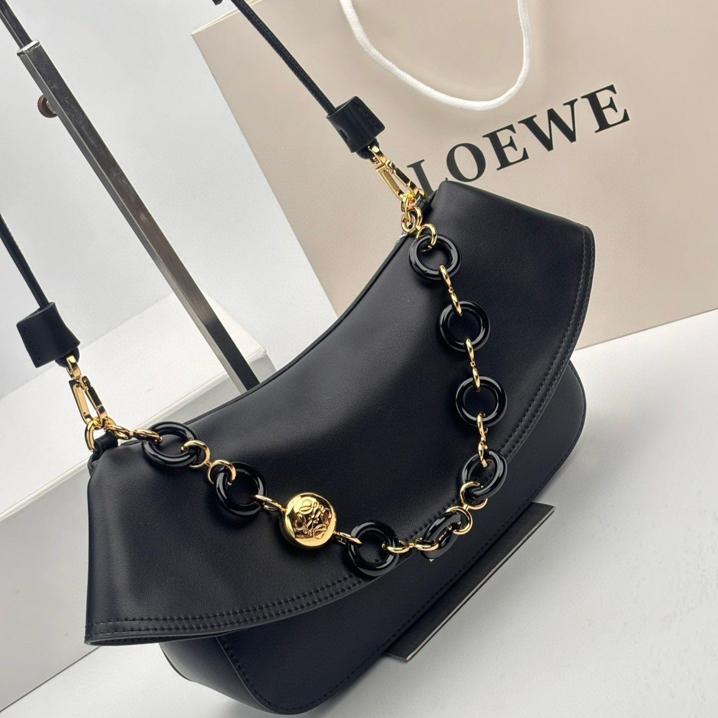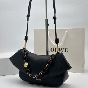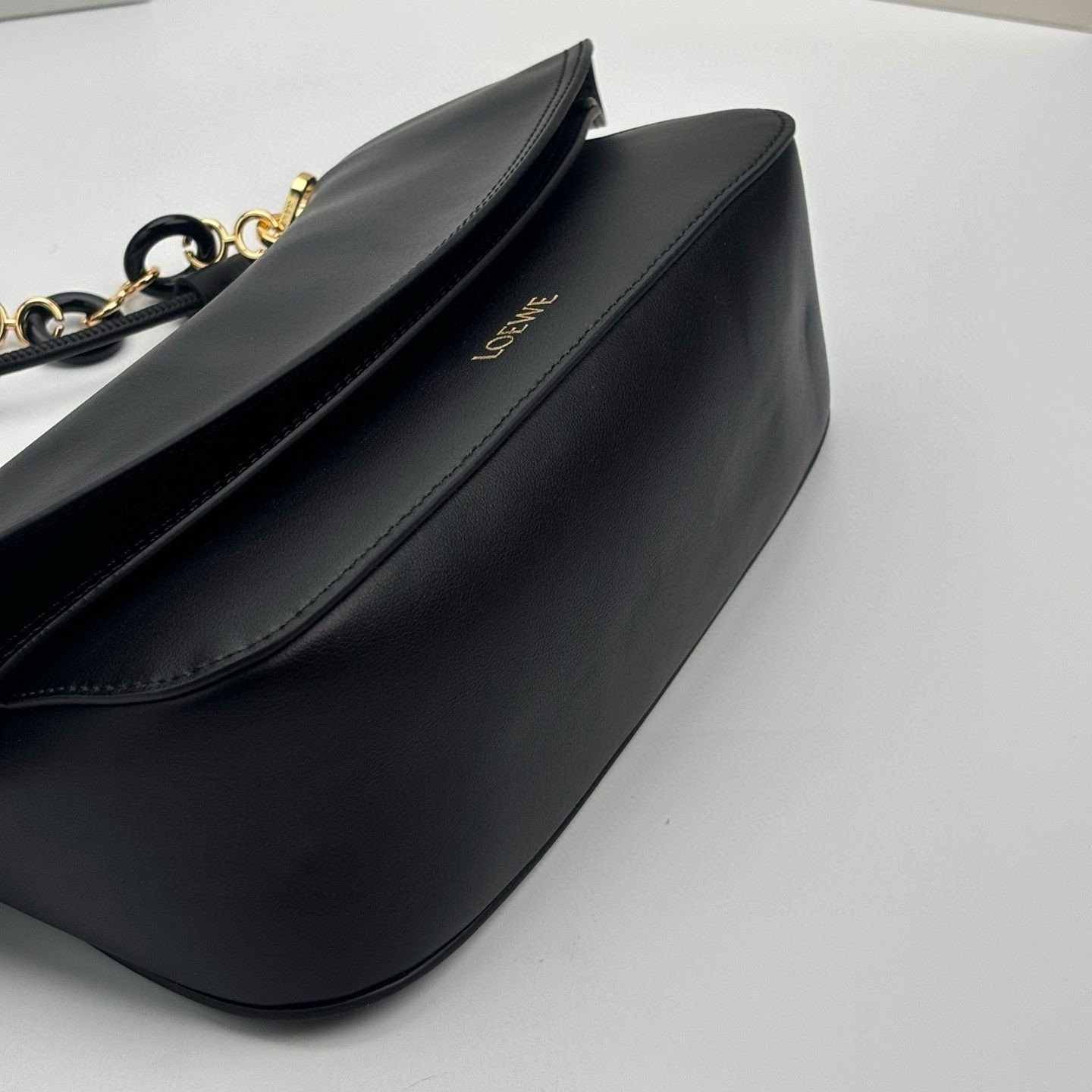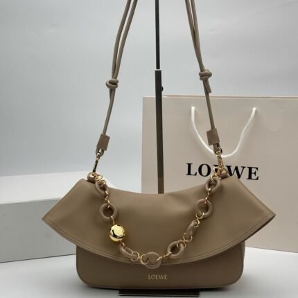 Detachable tubular calf leather shoulder strap with removable donut chain, flap closure, one interior pocket with embossed LOEWE logo, engraved Anagram smooth calf leather shoulder.
