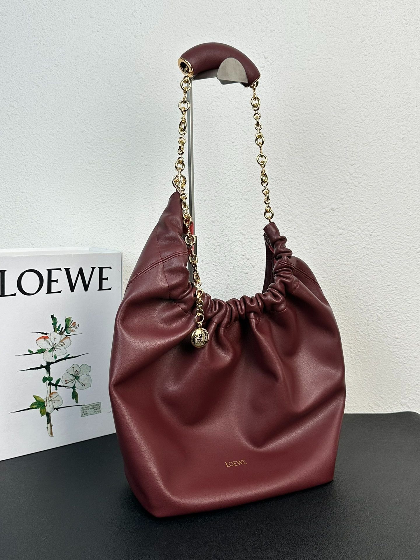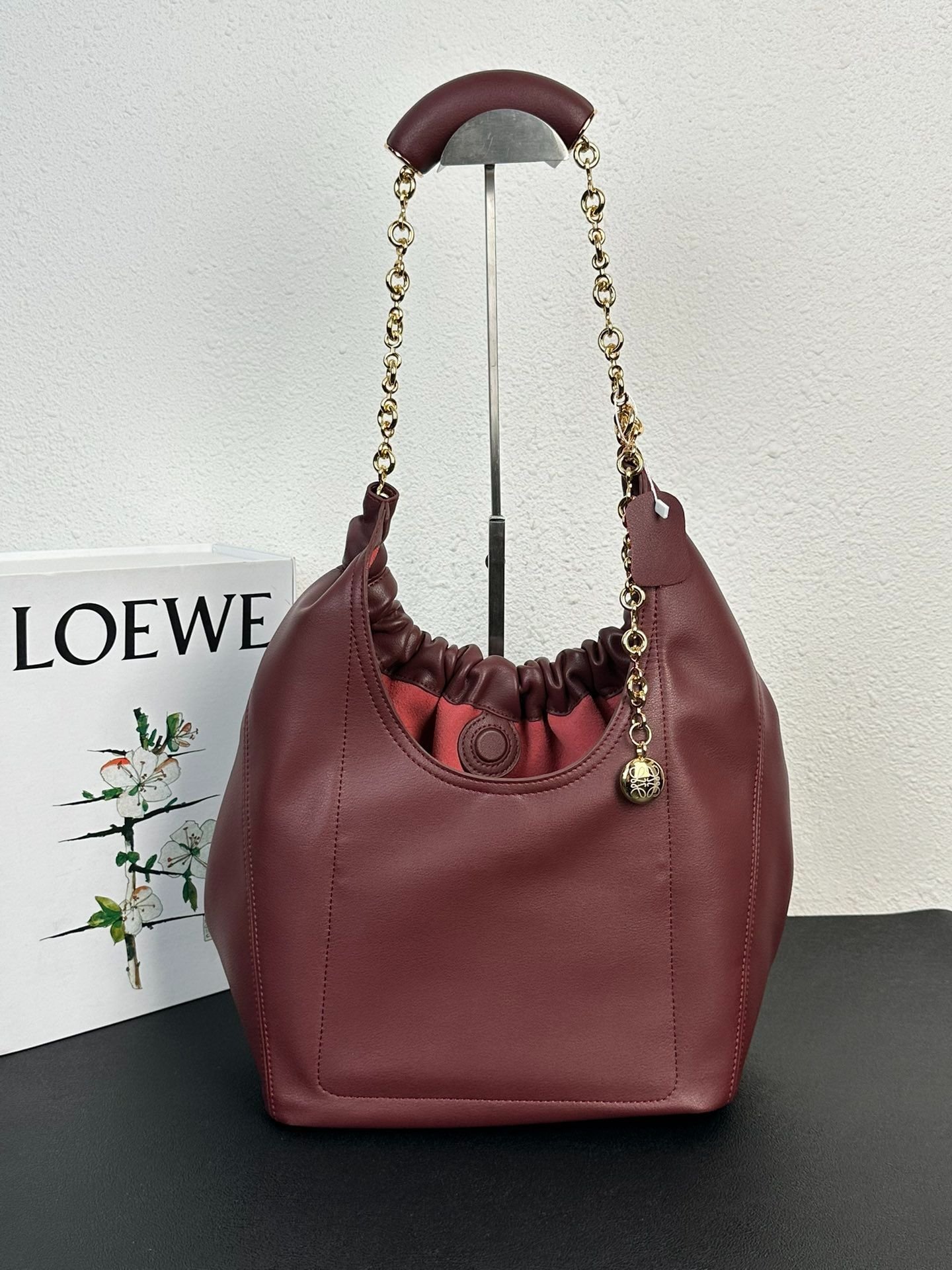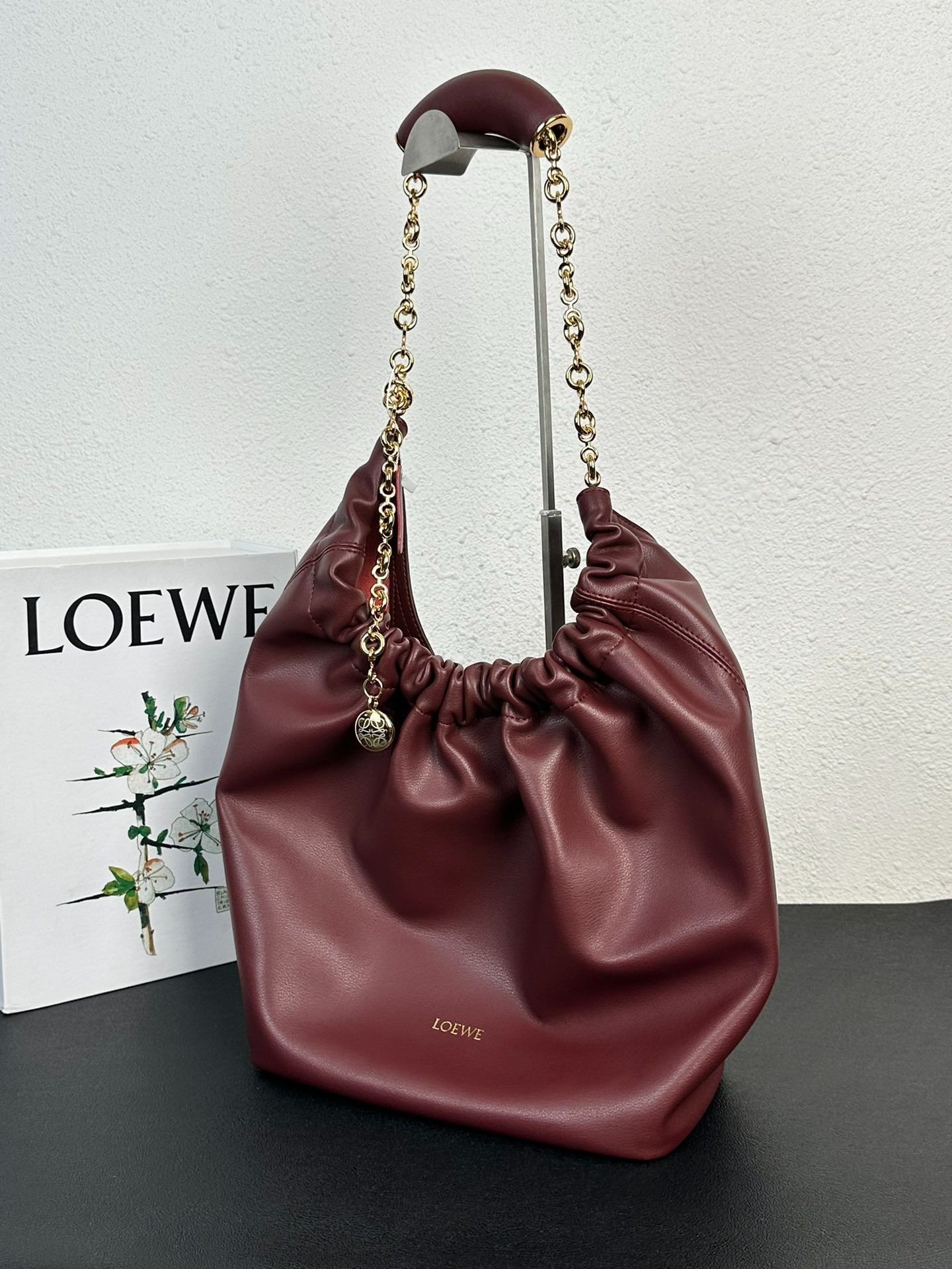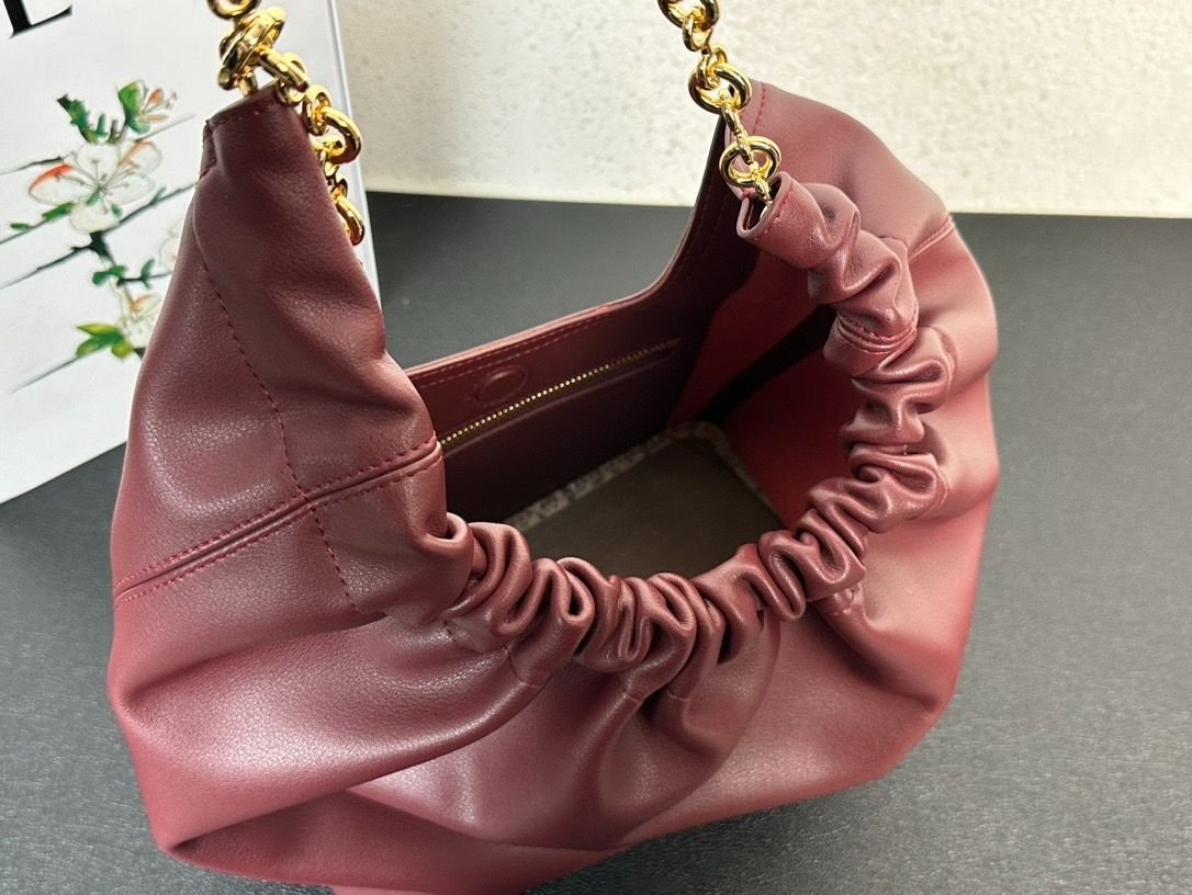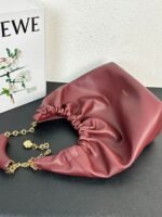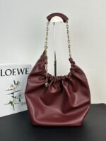 Loewe Squeeze Handbag, smooth calf leather, soft to the touch, drawstring closure, adjustable chain shoulder strap.
