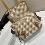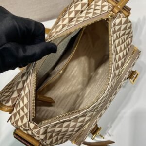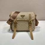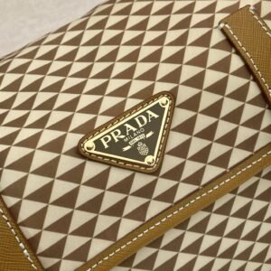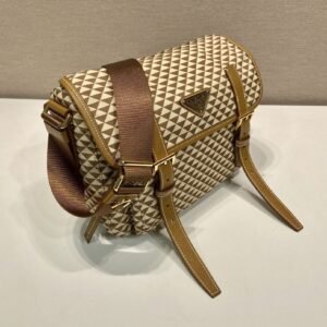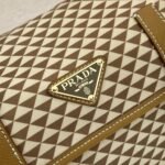 Upgraded version of the best-selling baokuanqnylon Hobo tote bag, featuring the original cross-grain pattern. Includes a detachable P-brand Re-Edition 2005 Saffiano leather nameplate with keyring, removable and adjustable logo fabric shoulder strap, detachable zippered leather pouch, and detachable metal chain shoulder strap. Top zipper closure. nylon lining, enameled triangular metal logo.
