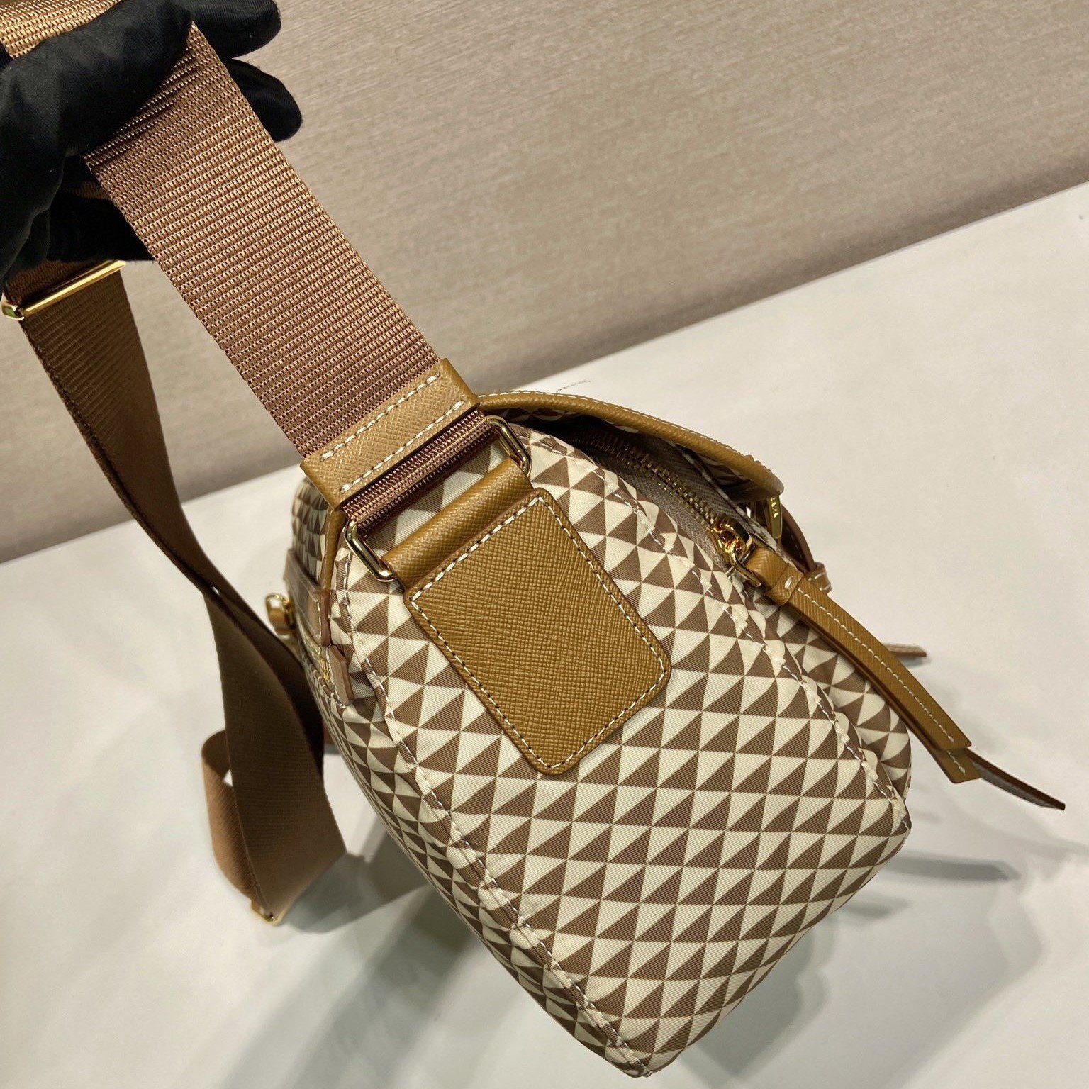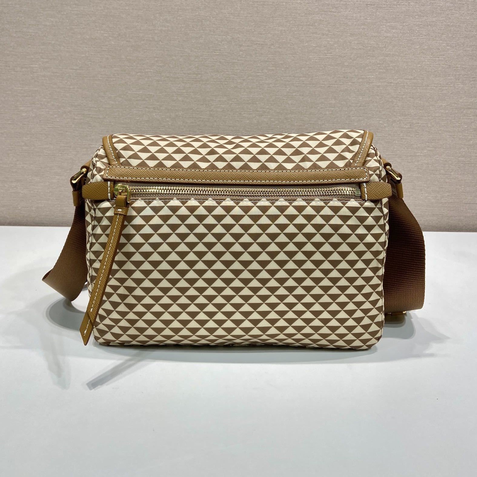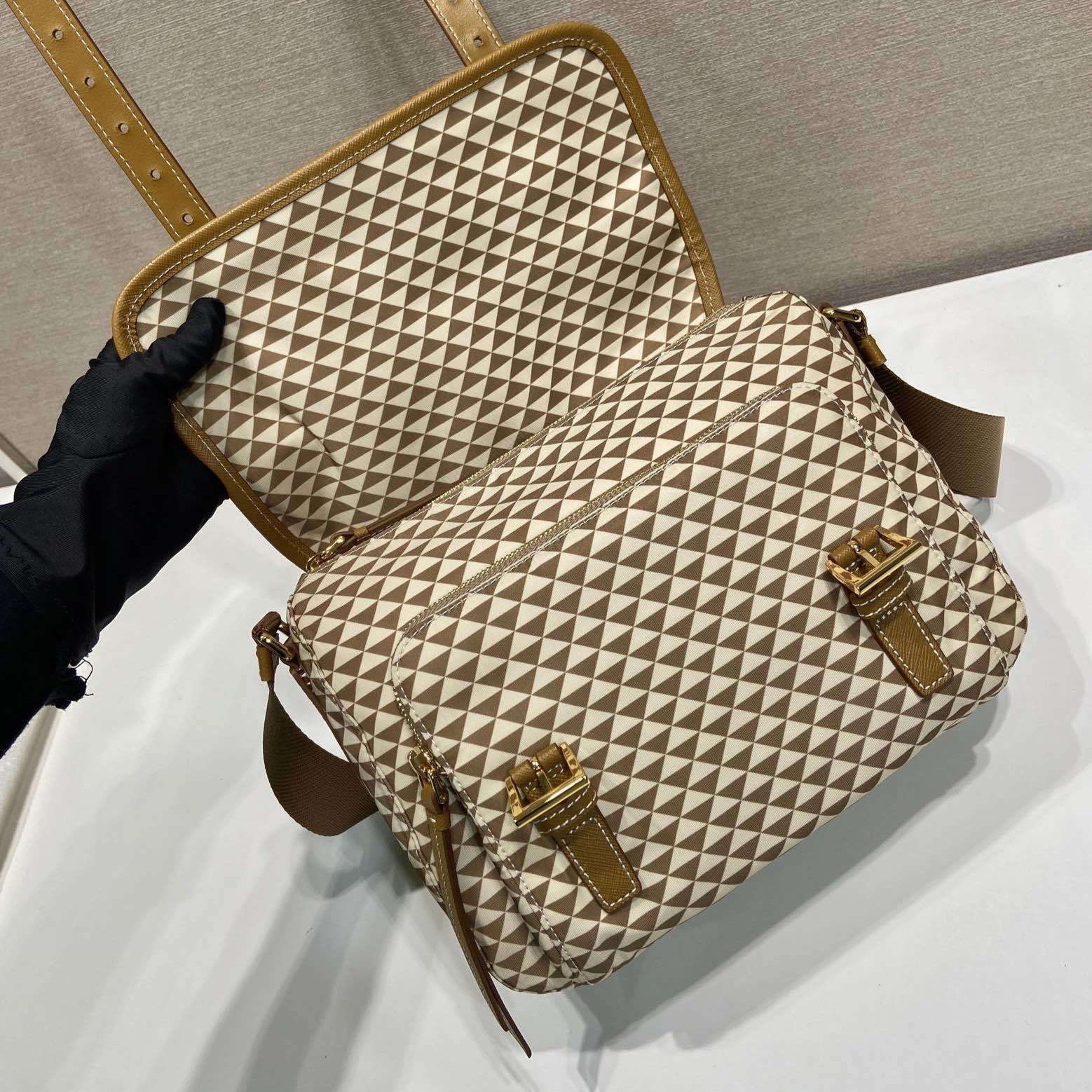 The Prada Symbole messenger bag features printed nylon fabric with cross-grain calf leather accents.
