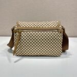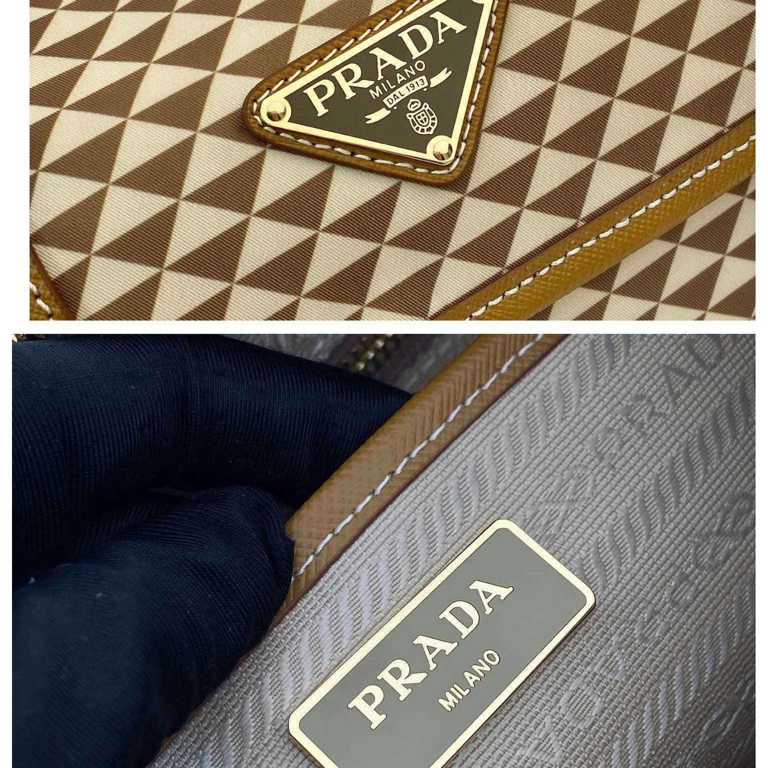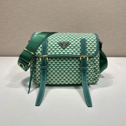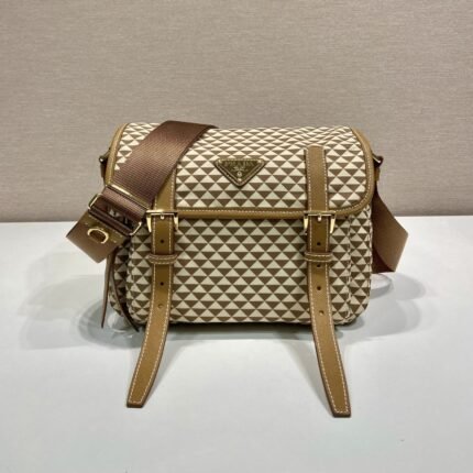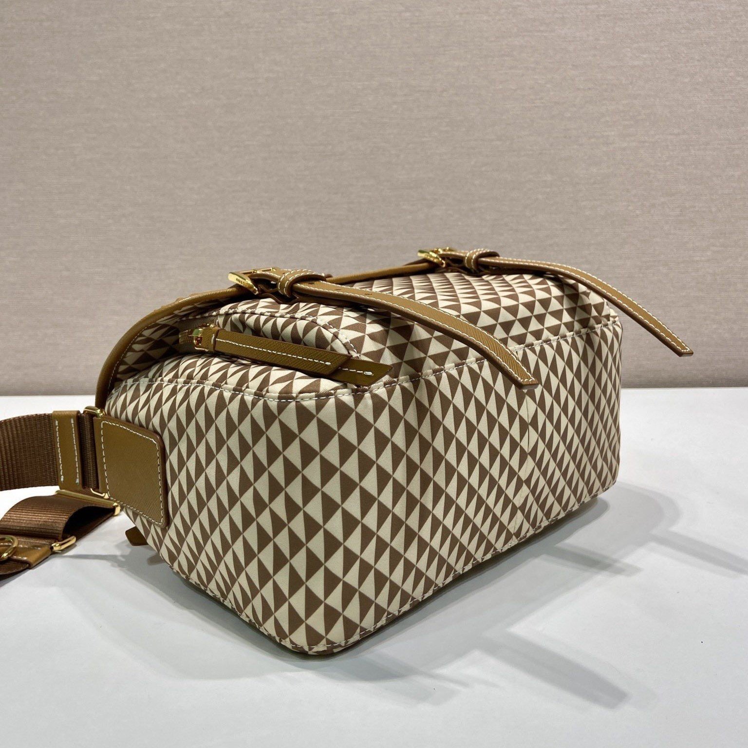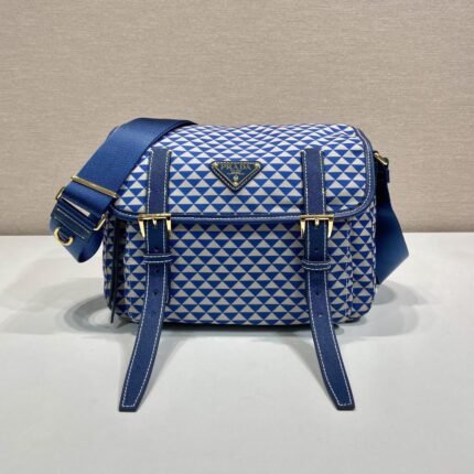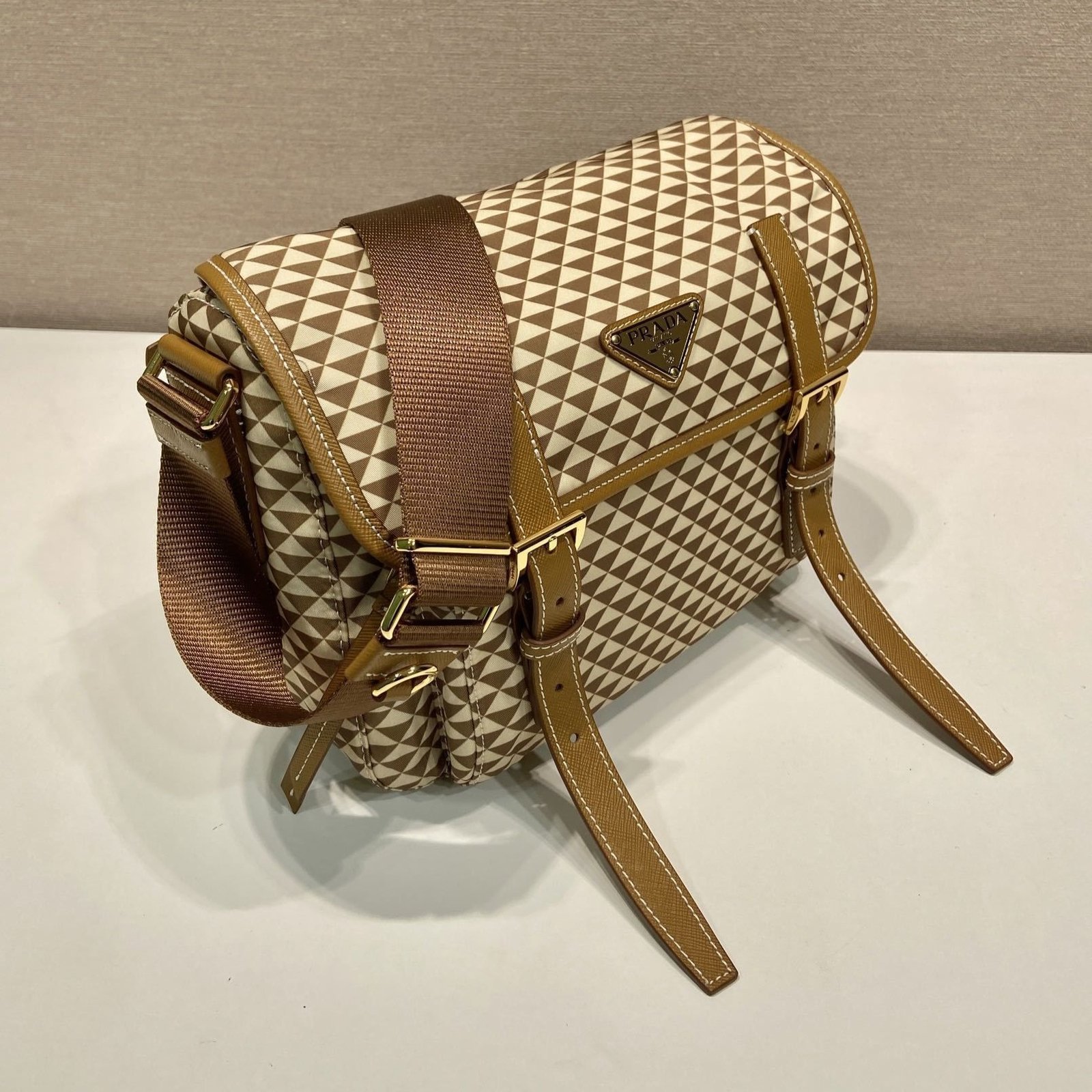 The Prada Symbole messenger bag features printed nylon fabric with cross-grain calf leather accents.
